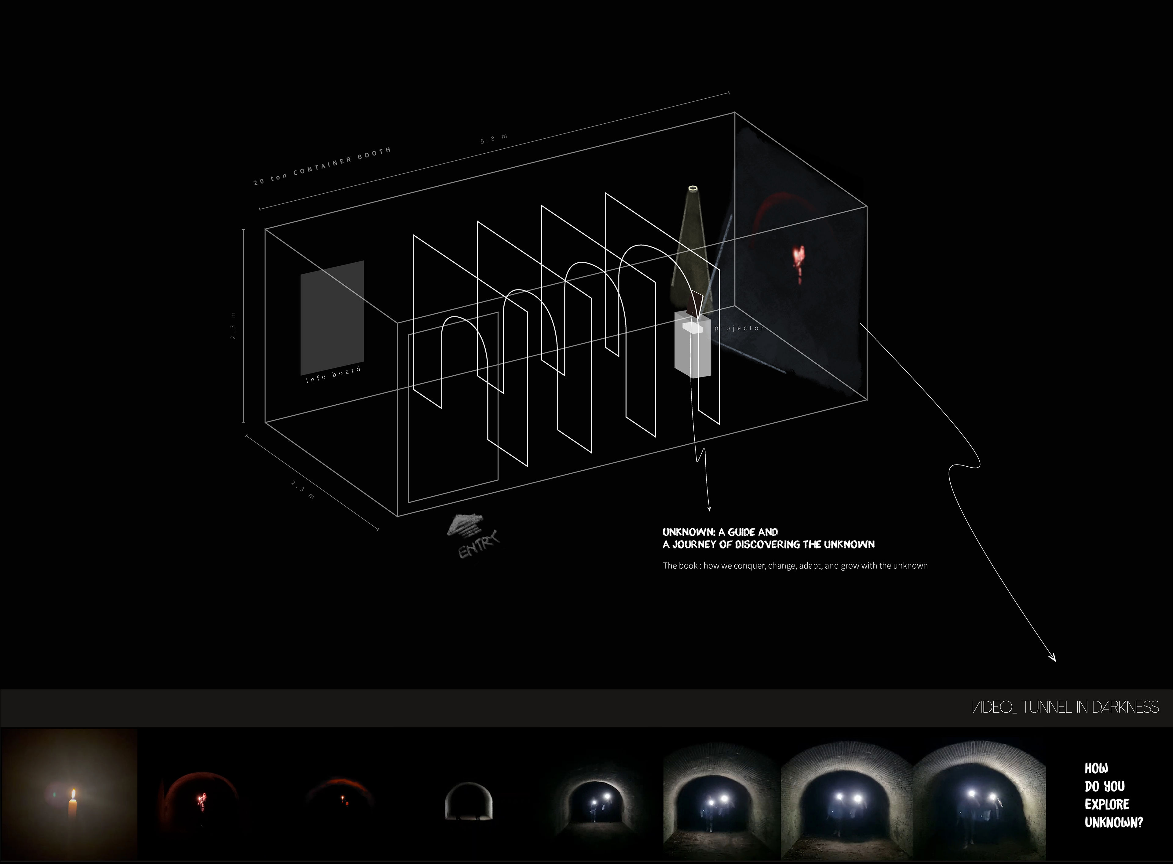 UNKNOWN의 전시 공간은 이 Tunnel in Darkness를 공간 경험으로 옮겨 놓은 작품으로, 미지의 문턱을 지나가는 과정을 느끼며 다양한 Unknown의 세계를 살펴보고 'How do you explore unknown? 당신은 어떻게 미지를 탐구하십니까?'를 되묻는다.